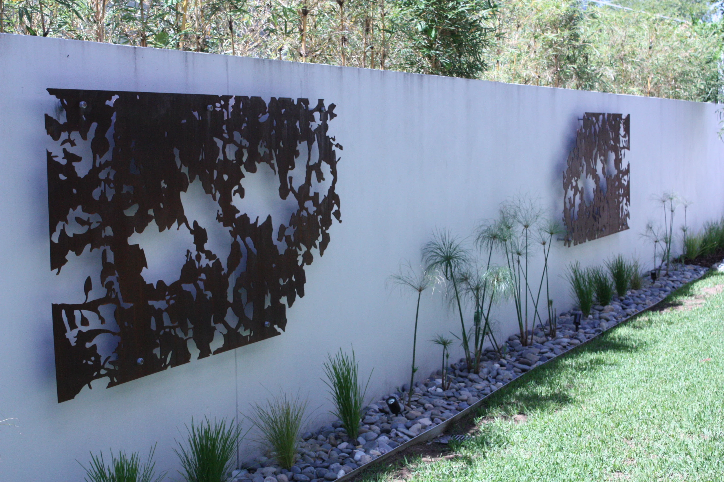 The focus of this area of the garden are the bespoke, laser-cut corten steel screens - a welcome visual break from the long, high rendered wall.