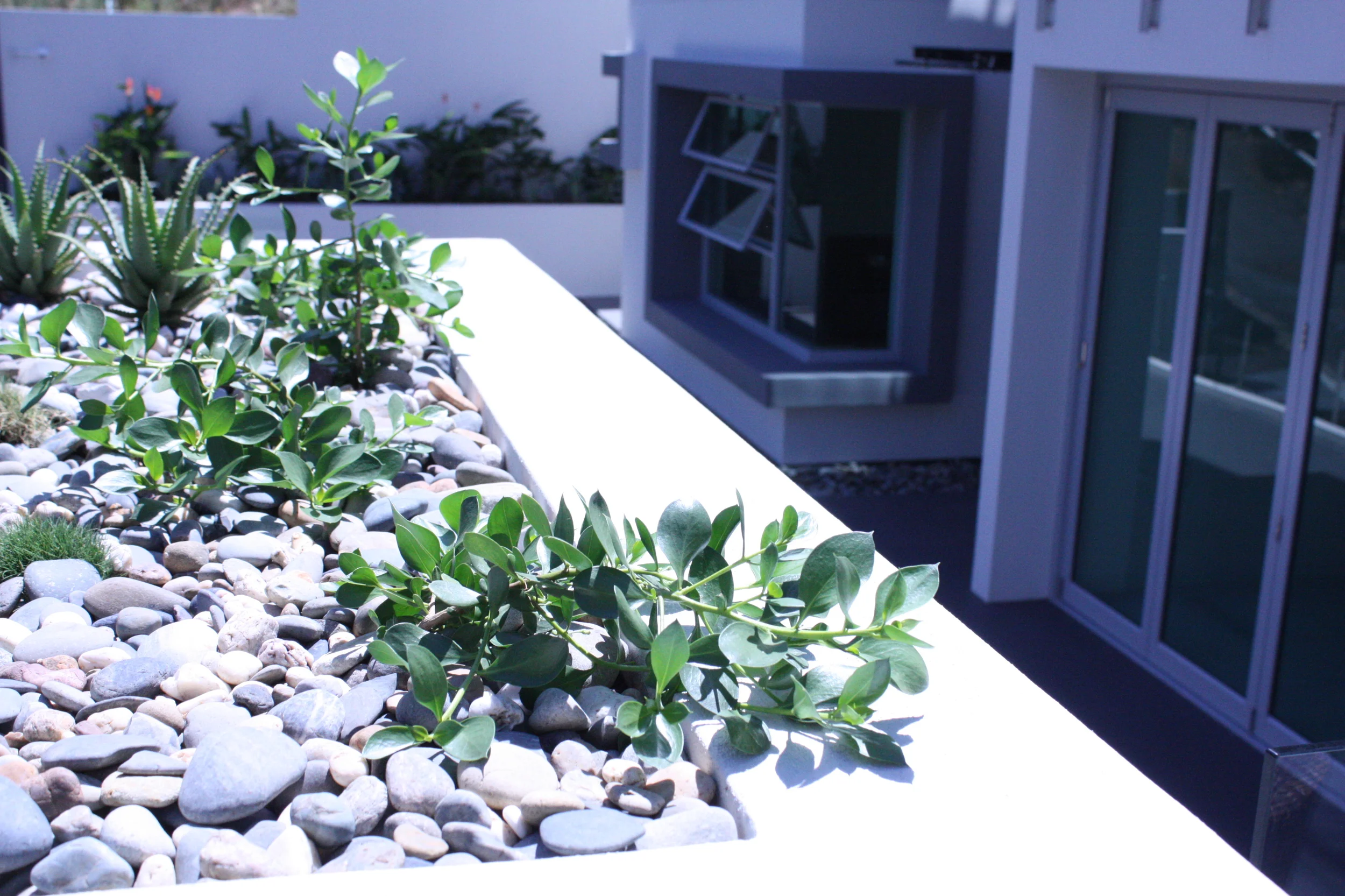 We chose adaptive succulents and desert/cactus planting in planter boxes due to heat in soil/root system. These were planted in low, wide pots to keep unhindered views of the Brisbane River and city line - a softening element to the overpowering paved surface. We used pots in a contrasting colour to punctuate as a soft focal point.