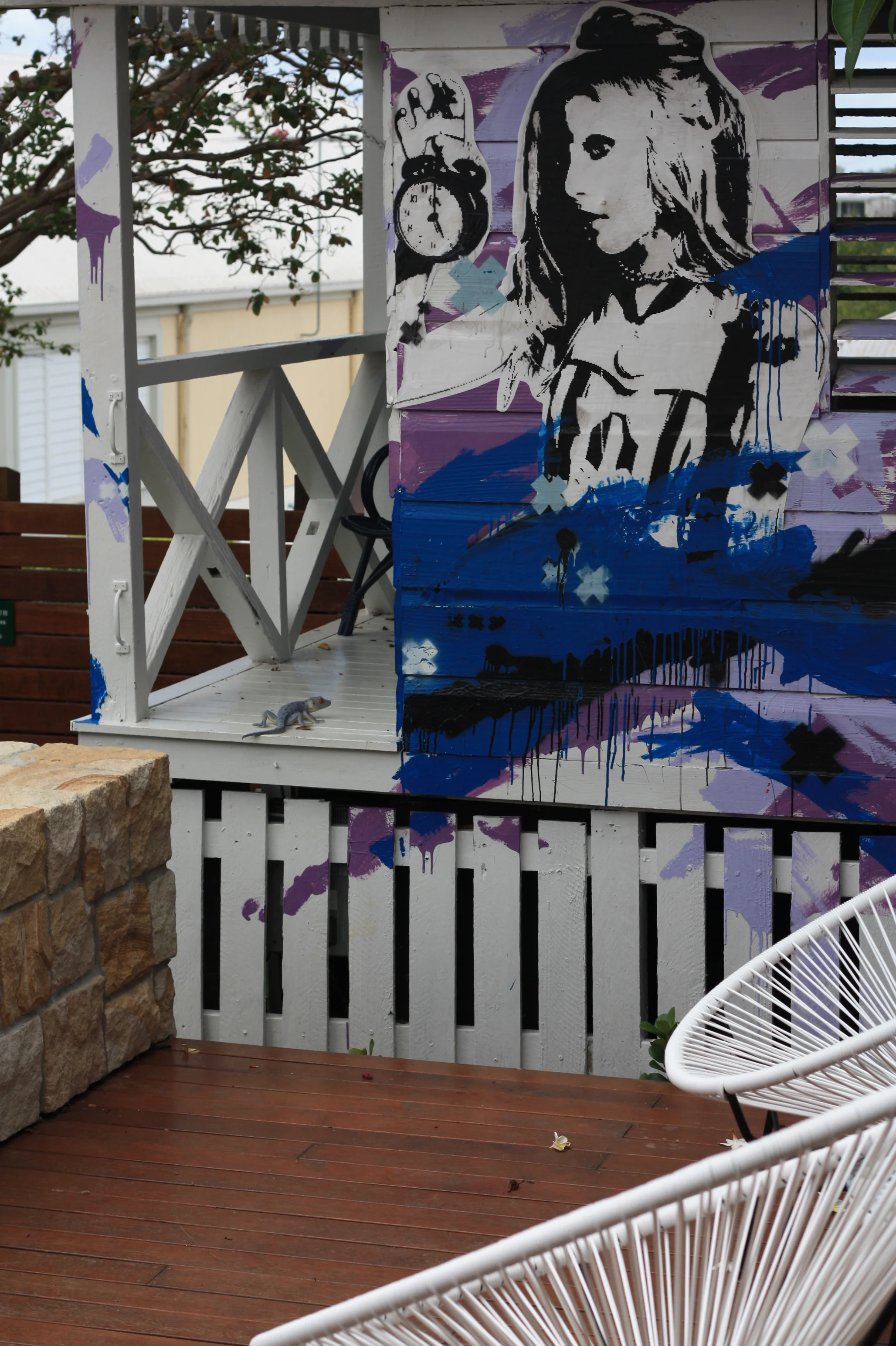 The existing cubby house was retained, and was ‘stencilled’ with urban art (graffiti) on the facade. This style of colourful art contrasts with the formality of the sandstone and timber, and adds an element of interest in the design.